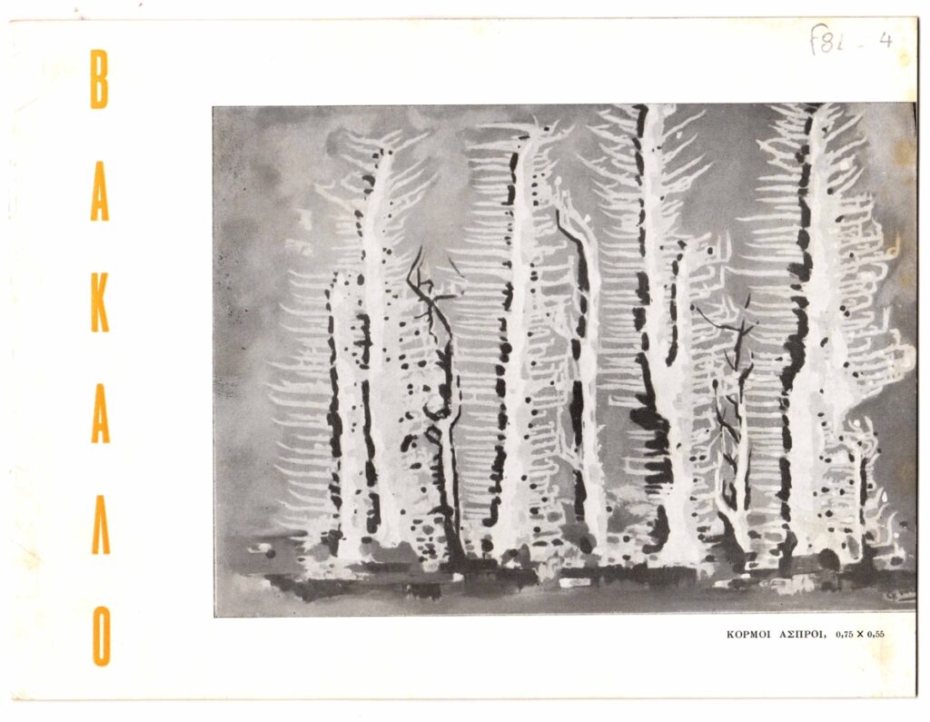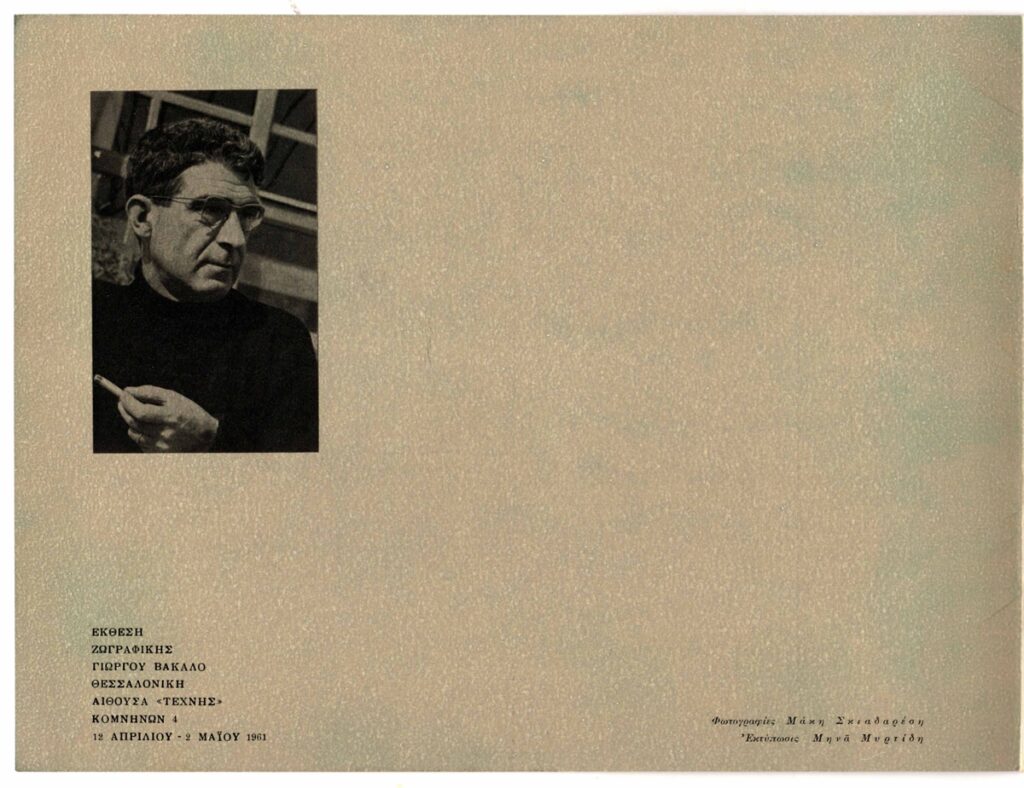 Έντυπο, χαρτόνι, 4 φφ, 16,5×22 εκ., έκθεσης του Γιώργου Βακαλό, στην Αίθουσα της Μακεδονικής Καλλιτεχνικής Εταιρείας Τέχνη στη Θεσσαλονίκη.