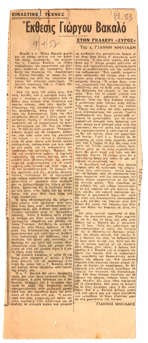 Απόκομμα, χαρτί, 25×15,5 εκ., στα ελληνικά, δημοσίευσης κριτικής έκθεσης του Γιώργου Βακαλό, η οποία διεξάγεται στην Galerie Ζυγός στην Αθήνα.