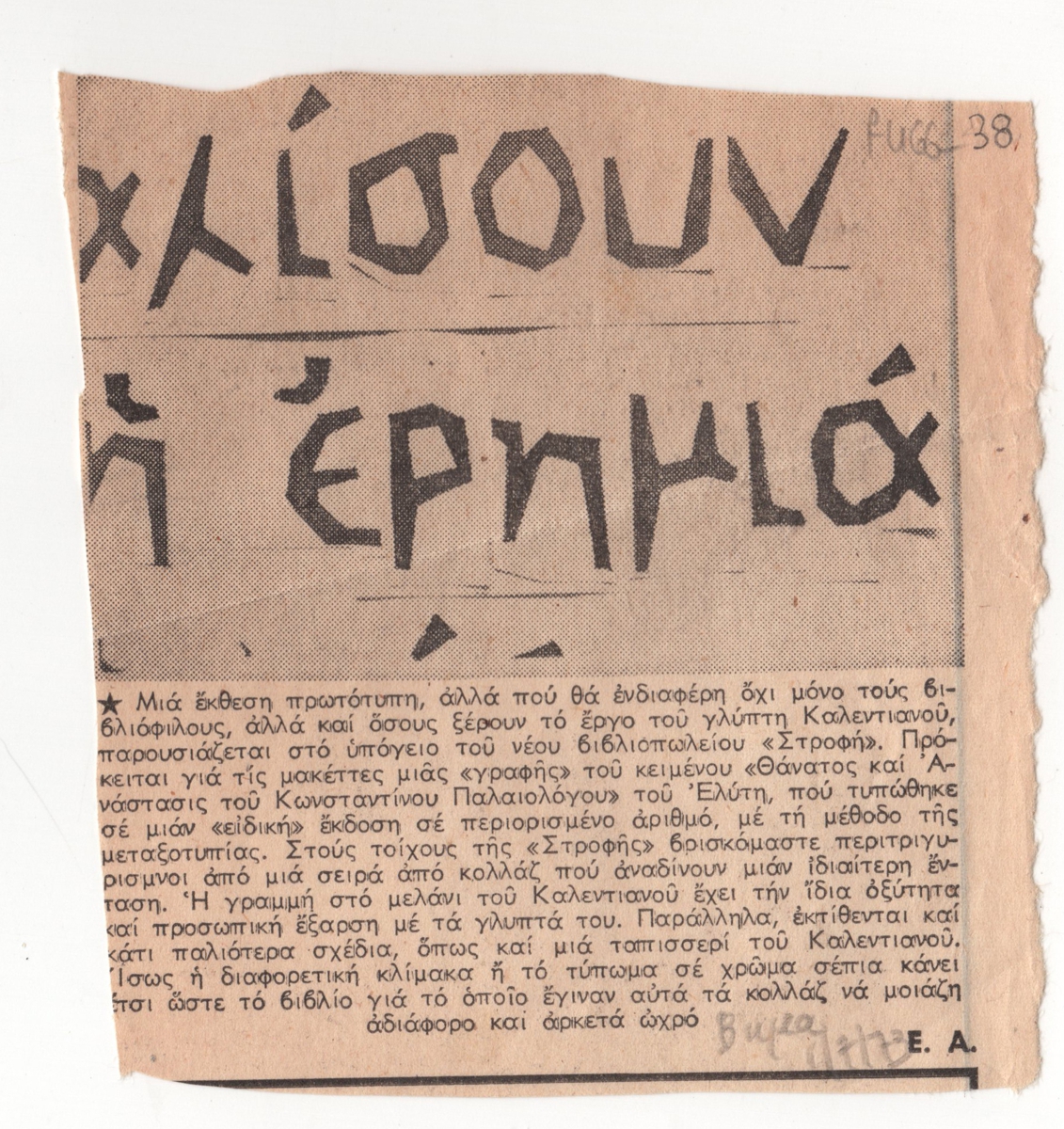 Απόκομμα, έντυπο, στα ελληνικά, σε χαρτί, 11,1×10,5 εκ., όπου δημοσιεύεται παρουσίαση της έκθεσης με τις μακέτες “γραφής” του κειμένου “Θάνατος και Ανάστασις του Κωνσταντίνου Παλαιολόγου” του Οδυσσέα Ελύτη, που τυπώθηκε σε ειδική έκδοση με τη μέθοδο της μεταξοτυπίας. Κάτω επιγραφή με τα στοιχεία της δημοσίευσης.