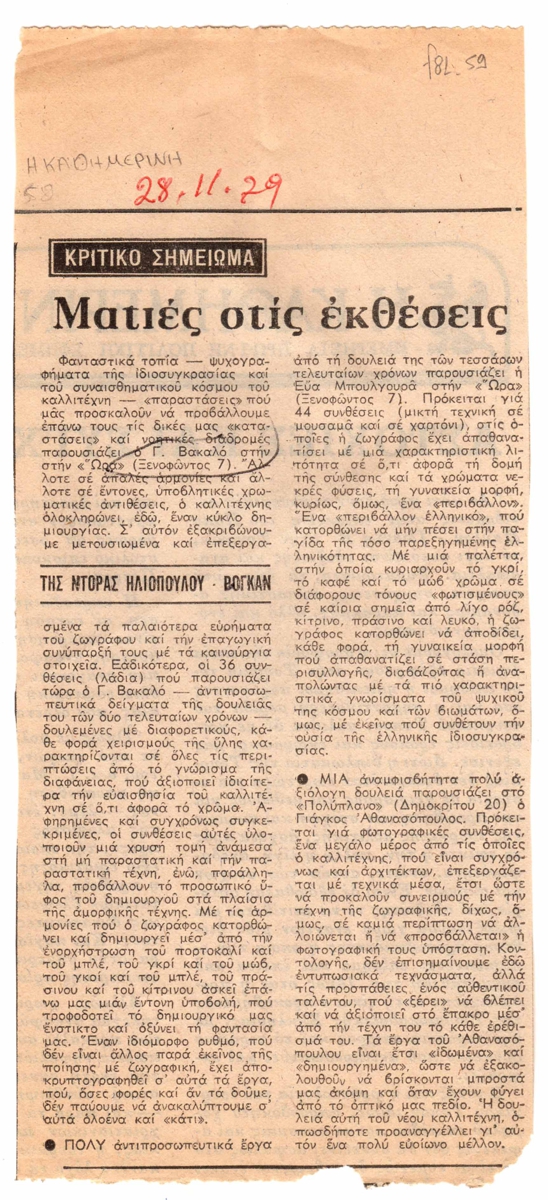 Απόκομμα, χαρτί, 23×10 εκ., στα ελληνικά, δημοσίευσης κριτικής έκθεσης του Γιώργου Βακαλό, η οποία διεξάγεται στο Καλλιτεχνικό Πνευματικό Κέντρο Ώρα στην Αθήνα.