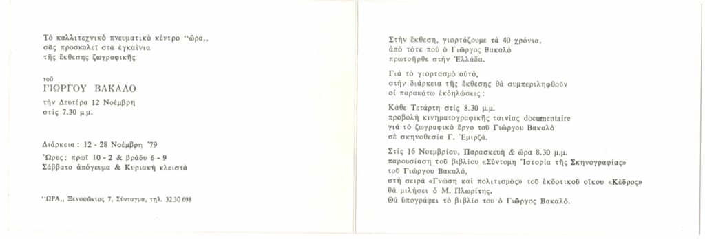 Πρόσκληση εγκαινίων, χαρτόνι αναδιπλωμένο, 11×16 εκ., στα ελληνικά, έκθεσης του Γιώργου Βακαλό. Αναγράφονται εκδηλώσεις που επρόκειτο να πραγματοποιηθούν στο πλαίσιο της έκθεσης.