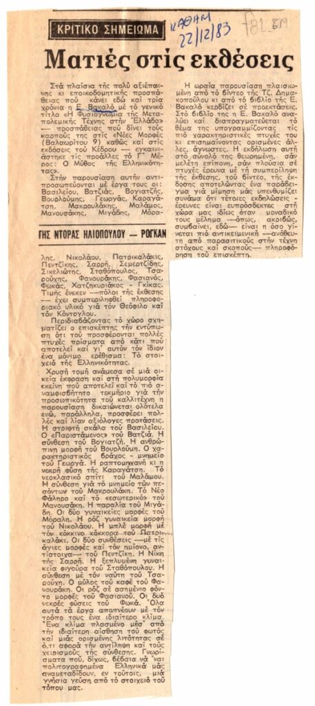 Απόκομμα, χαρτί, 26×11 εκ., στα ελληνικά, δημοσίευσης κριτικής έκθεσης στην γκαλερί Νέες Μορφές, στην Αθήνα, στο πλαίσιο παρουσίασης του τρίτου τόμου της Ελένης Βακαλό με τίτλο “Ο μύθος της Ελληνικότητας”, από τη σειρά “Η φυσιογνωμία της Μεταπολεμικής Τέχνης στην Ελλάδα”.