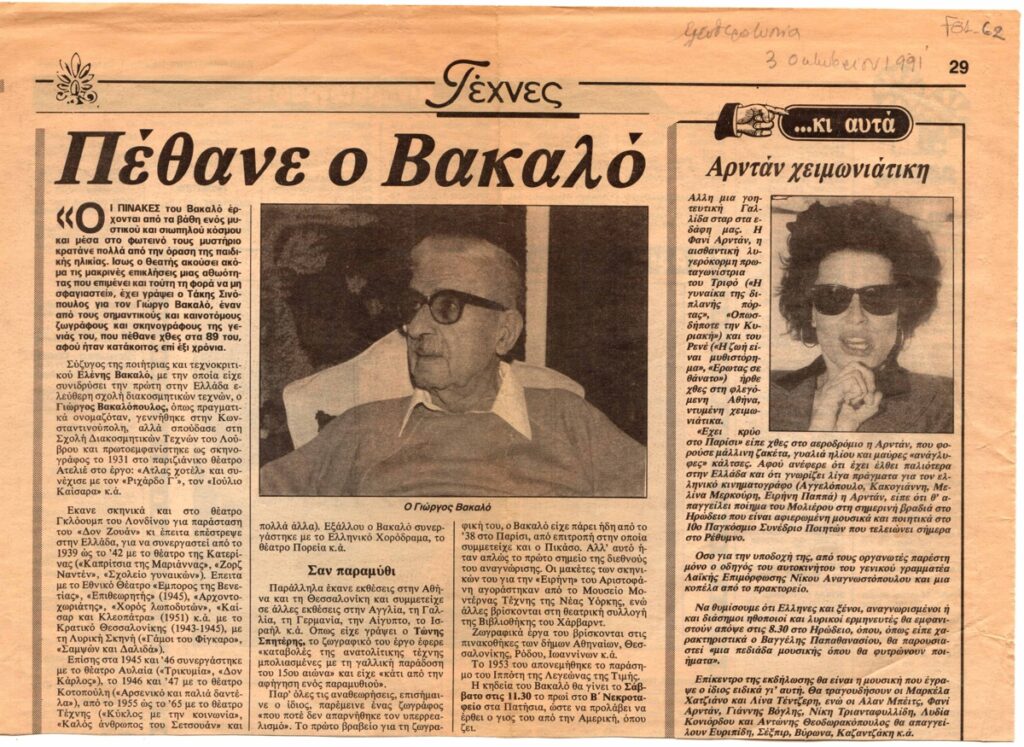 Απόκομμα, χαρτί, 29×21 εκ., στα ελληνικά, δημοσίευσης αναφερόμενης στο θάνατο του Γιώργου Βακαλό.