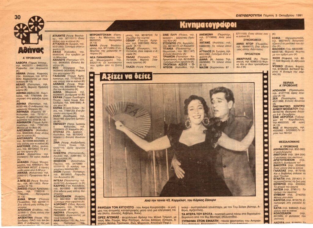 Στην πίσω όψη υπάρχει πρόγραμμα κινηματογραφικών προβολών της περιόδου. Το απόκομμα εικονογραφείται και φέρει επιγραφές.