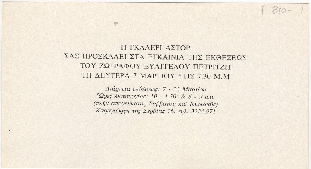 Πρόσκληση, χαρτόνι, 11×20 εκ., στα ελληνικά, εγκαινίων ατομικής έκθεσης ζωγραφικής του Ευάγγελου Πετρίτζη.