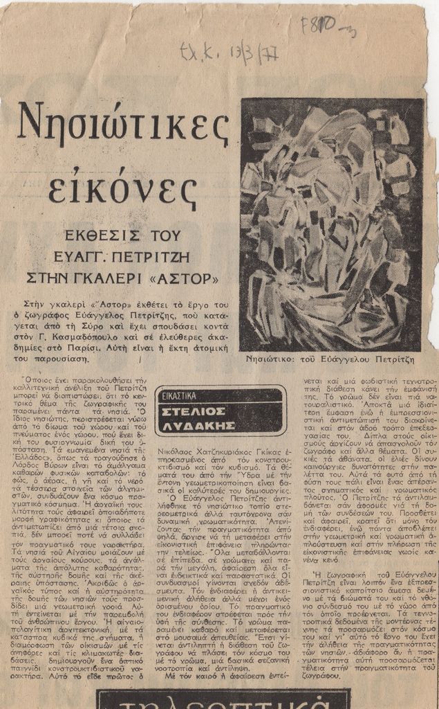 Απόκομμα, χαρτί, 25×16 εκ., στα ελληνικά, δημοσίευσης κριτικής έκθεσης του Ευάγγελου Πετρίτζη, η οποία διεξάγεται στην Γκαλερί Άστορ στην Αθήνα.