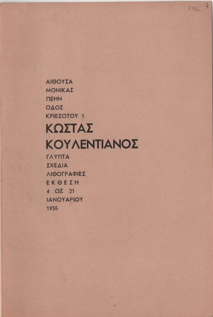 Έντυπο έκθεσης, στα ελληνικά, δίπτυχο, σε χαρτόνι, 25,0×16,7 εκ. Έντυπο της ατομικής έκθεσης έργων του Κώστα Κουλεντιανού στην Αθήνα το 1955. Περιέχει κείμενο για τον καλλιτέχνη, κατάλογο εκθέσεων και κατάλογο έργων της έκθεσης. Εικονογραφείται με αναπαραγωγή έργου.