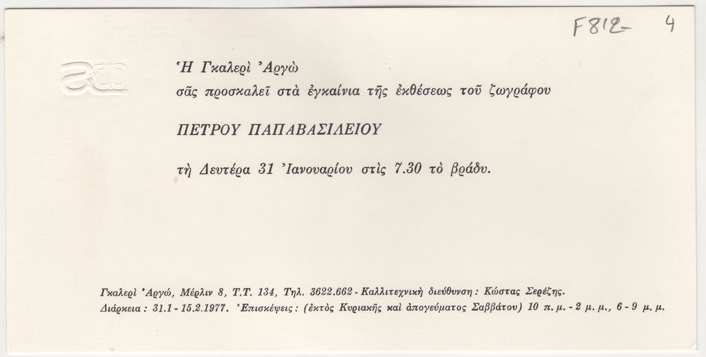 Πρόσκληση, χαρτόνι, 10×20 εκ., στα ελληνικά, εγκαινίων ατομικής έκθεσης του Πέτρου Παπαβασιλείου.