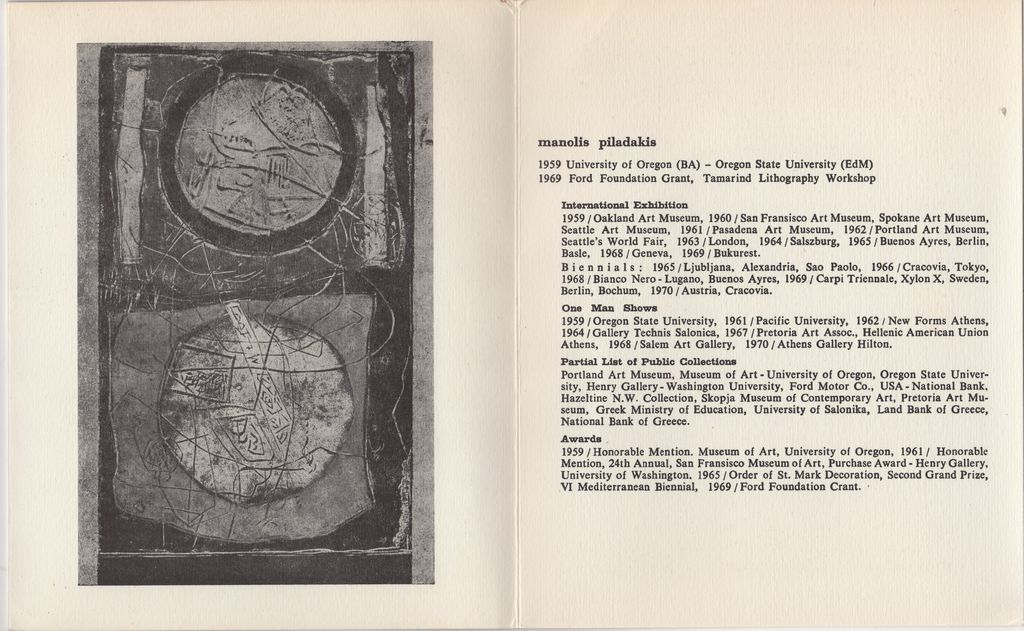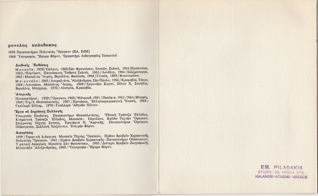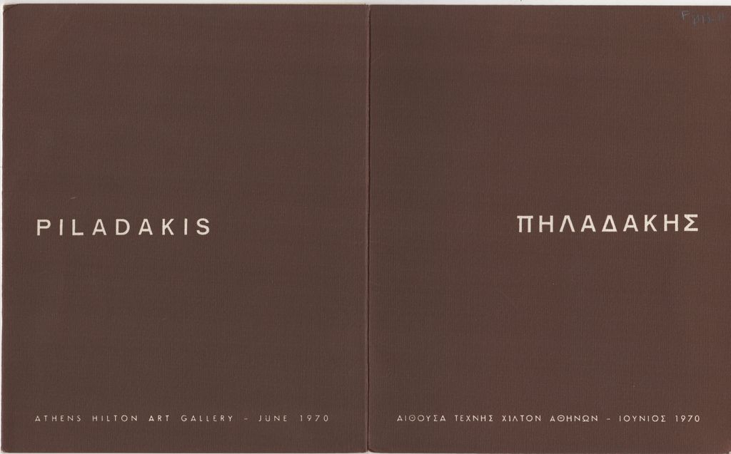 Έντυπο, χαρτόνι δίπτυχο, 20.5×16.5 εκ., στα ελληνικά και σε αγγλική μετάφραση, ατομικής έκθεσης του Μανώλη Πηλαδάκη.