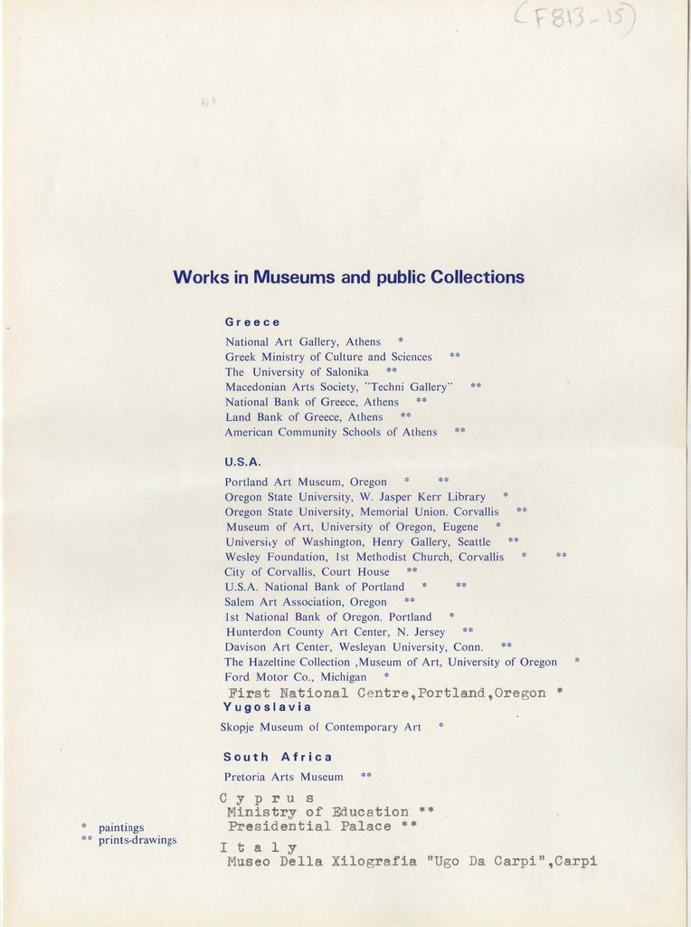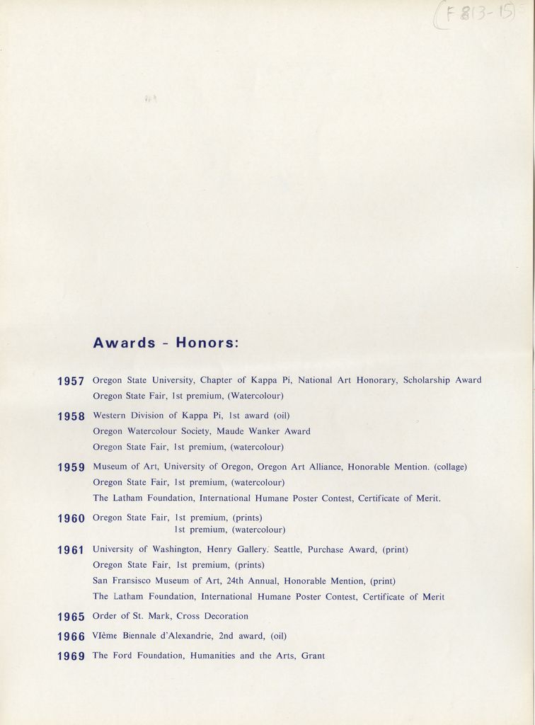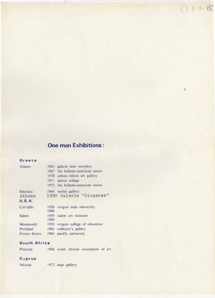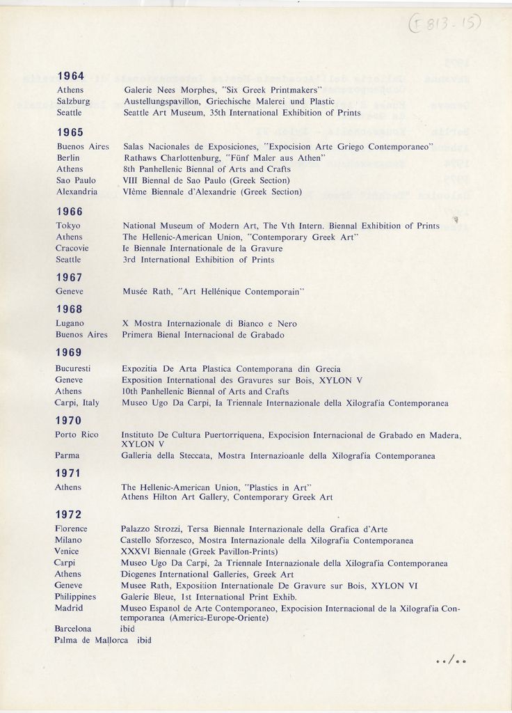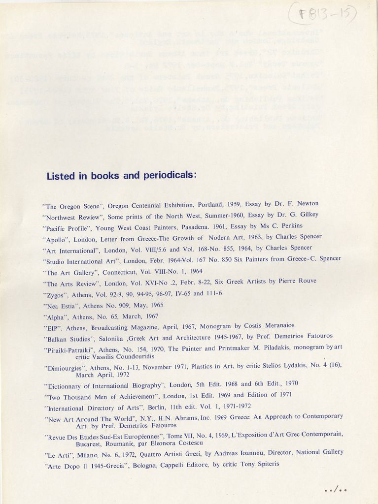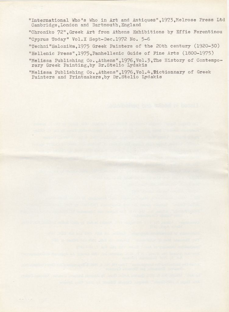 Περιέχει πλήρες βιογραφικό σημείωμα του καλλιτέχνη, με λίστα εκθέσεων ατομικών και ομαδικών, συλλογές έργων του σε μουσεία και γκαλερί, βραβεύσεις-διακρίσεις και σχετική βιβλιογραφία.