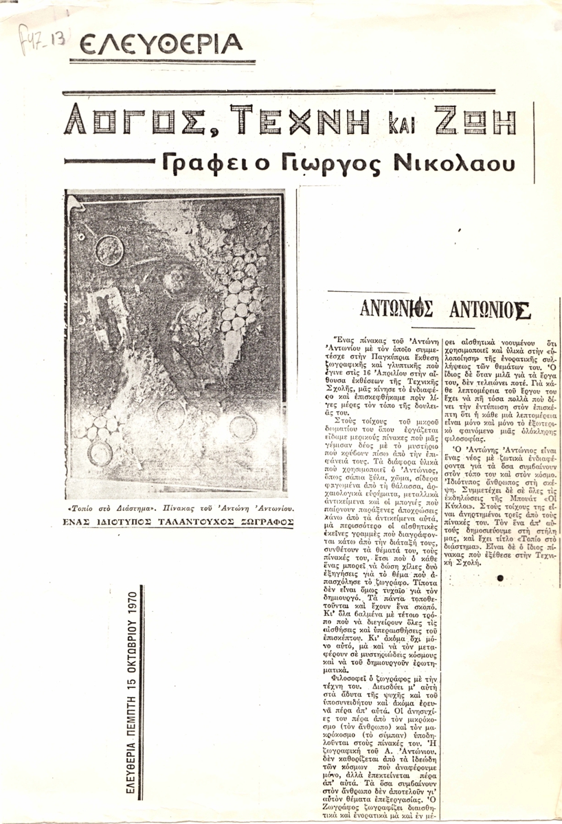 Φωτοαντίγραφο, χαρτί, 31×21,5εκ, στα ελληνικά, άρθρου για τον Αντώνη Αντώνιο.