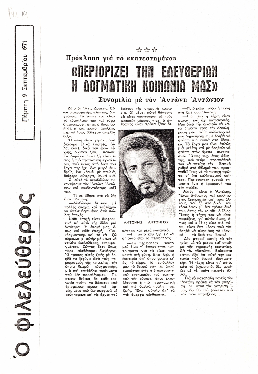 Πρόκληση για το ‘κατεστημένο’. ‘Περιορίζει την ελευθερίαν η δογματική κοινωνία μας’. Συνομιλία με τον Αντώνη Αντώνιον