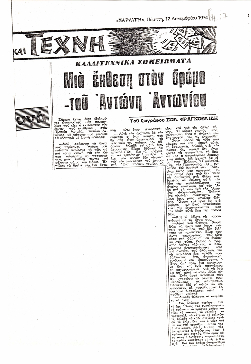 Φωτοαντίγραφο, χαρτί, 2 φφ, 29,5×21 και 15.5×7,5 εκ αντίστοιχα, στα ελληνικά, συνέντευξης του Αντώνη Αντώνιου στο ζωγράφο Σόλων/Σολωμό Φραγκουλίδη. Εντάσσεται στη στήλη “Καλλιτεχνικά Σημειώματα”.
