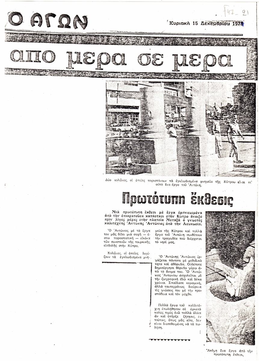 Φωτοαντίγραφο, χαρτί, 30×21εκ, στα ελληνικά, δημοσίευσης άρθρου αναφερόμενου στην έκθεση του Αντώνη Αντώνιου στην Πλατεία Μεταξά Κύπρου.