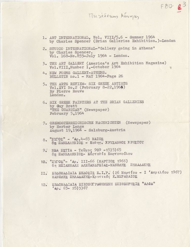 Βιβλιογραφία, δακτυλόγραφη, 29×21 εκ., χαρτί, στα ελληνικά, γερμανικά, γαλλικά και αγγλικά, για τον Μανώλη Πηλαδάκη. Αναγράφονται δημοσιεύσεις στον ελληνικό και ευρωπαϊκό Τύπο.