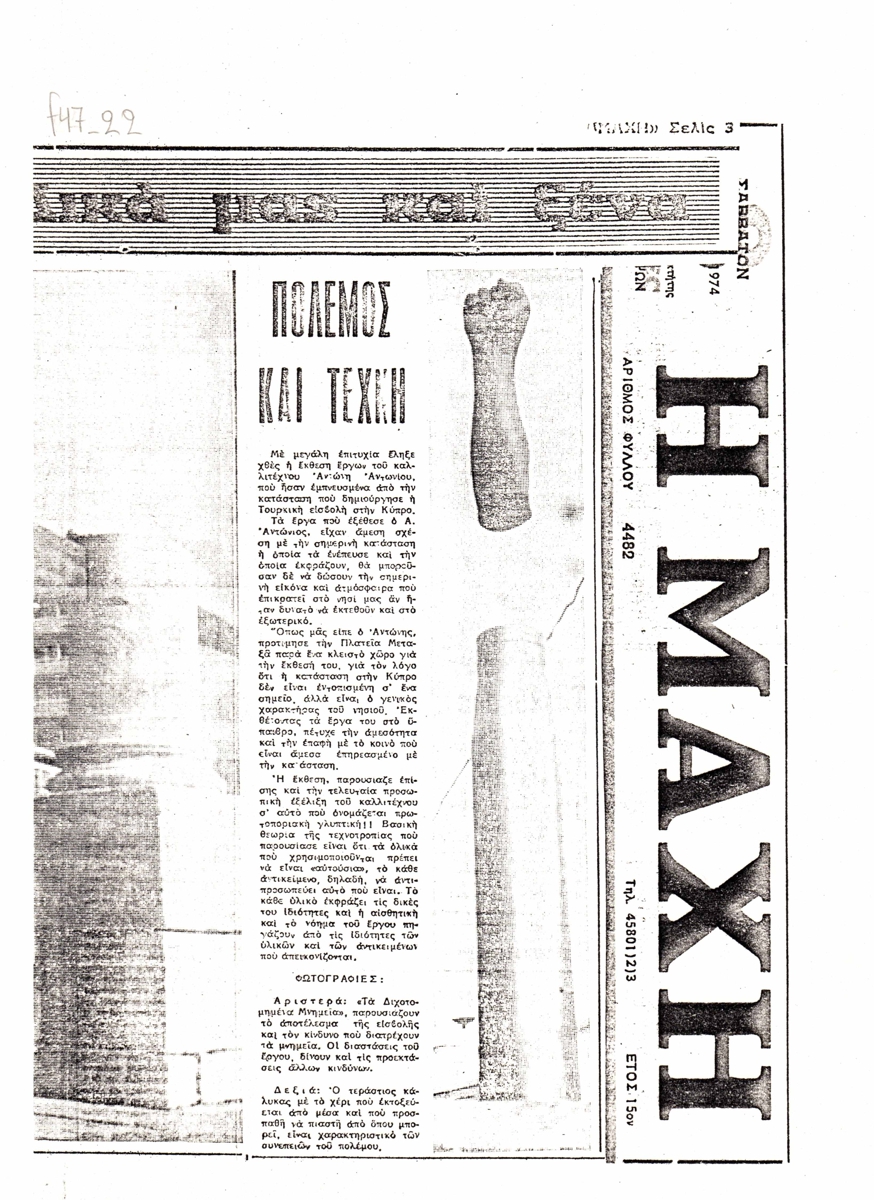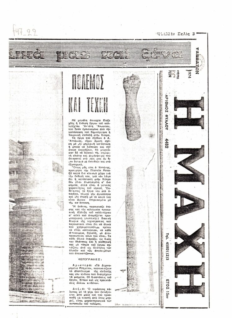 Φωτοαντίγραφο, χαρτί, 29,5×21εκ, στα ελληνικά, άρθρου αναφερόμενου στην έκθεση του Αντώνη Αντωνίου στην Πλατεία Μεταξά στη Λευκωσία.