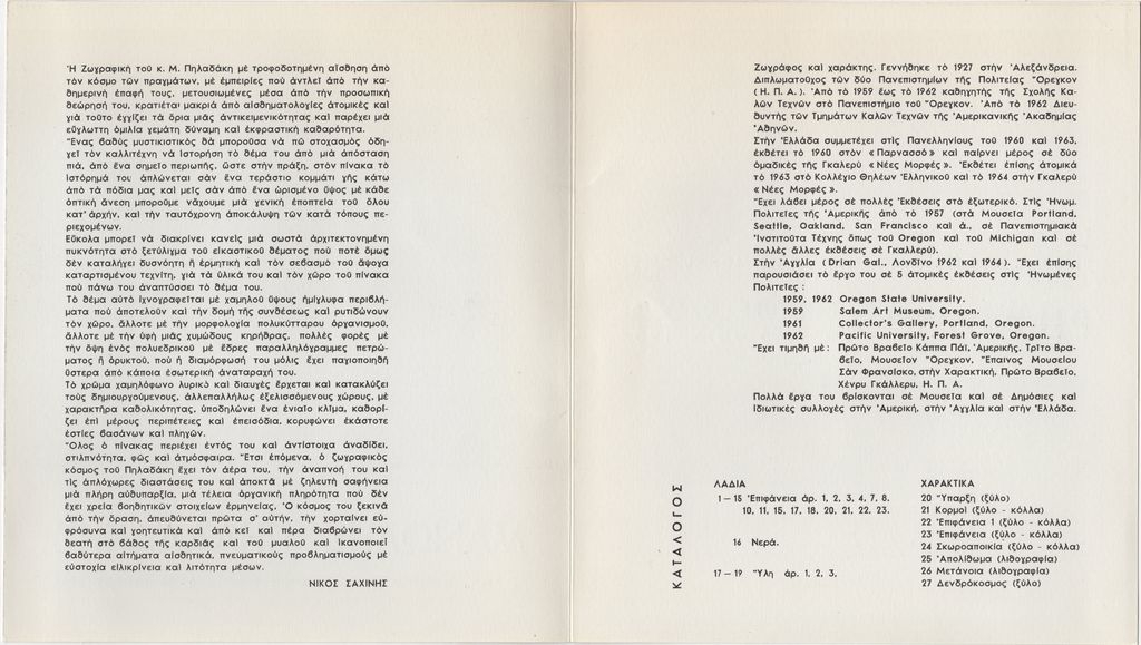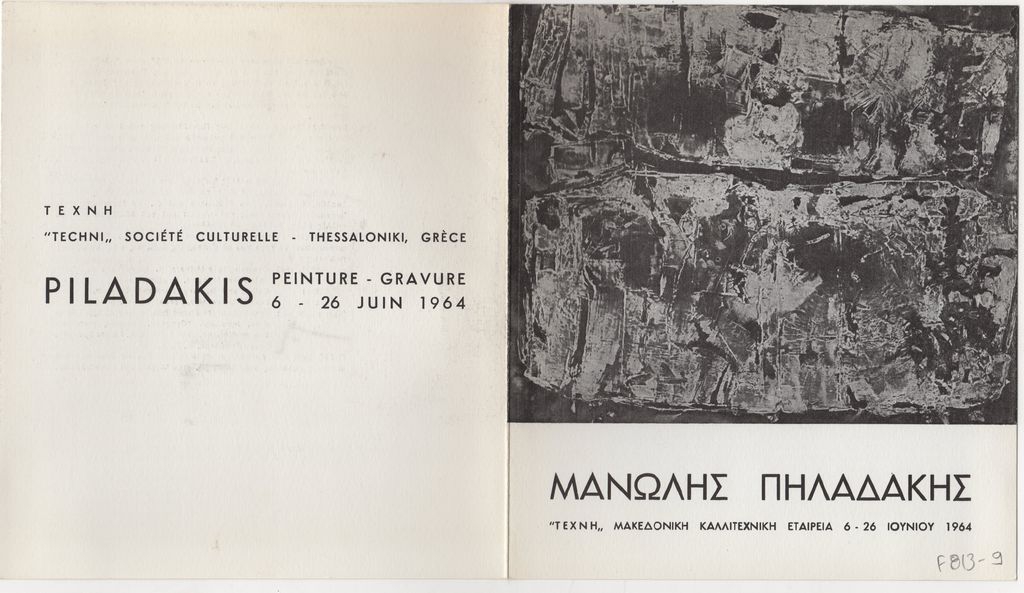 Έντυπο, χαρτόνι αναδιπλωμένο, 20×17,5 εκ., στα ελληνικά, ατομικής έκθεσης του Μανώλη Πηλαδάκη, στην Μακεδονική Καλλιτεχνική Εταιρεία Τέχνη στη Θεσσαλονίκη.