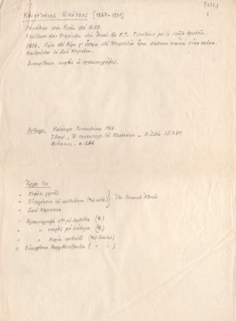 Κείμενο, χειρόγραφο, με μολύβι, στα ελληνικά, χαρτί, 28,8×21,2 εκ. Βιογραφικό του ζωγράφου Νικόλαου Κουνελάκη. Αναφέρονται κύρια βιογραφικά στοιχεία, βιβλιογραφία και εργογραφία.