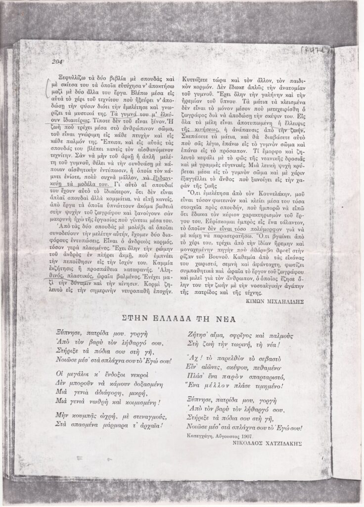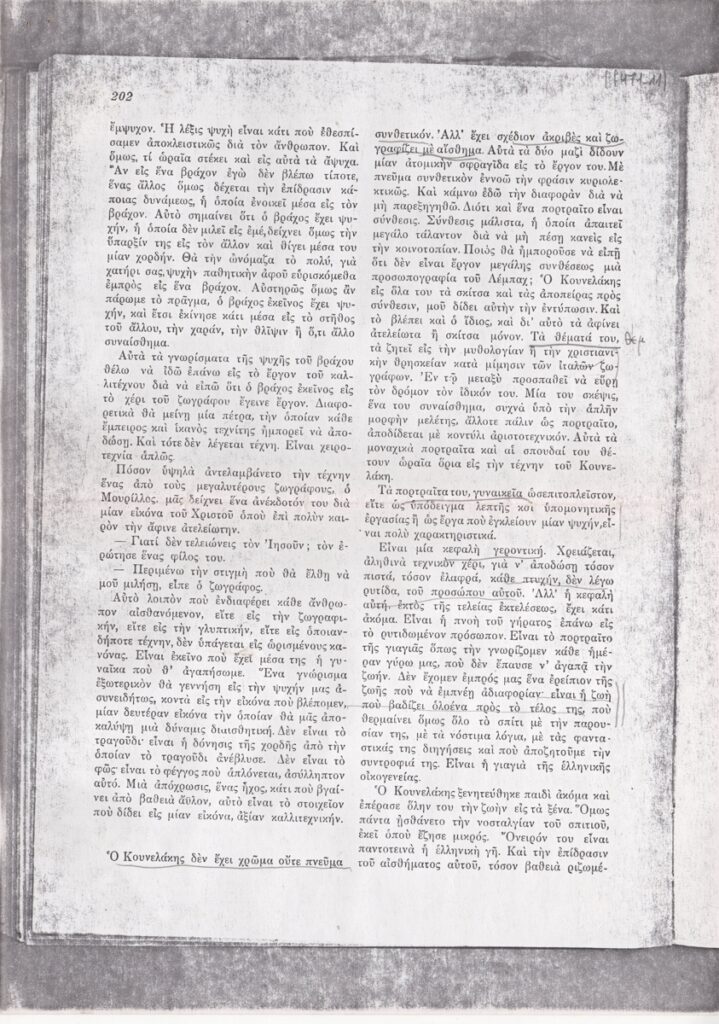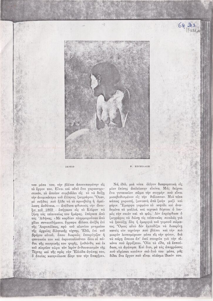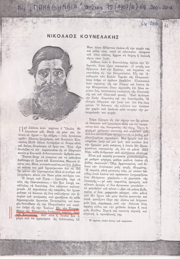 Φωτοαντίγραφο αποκόμματος εντύπου, στα ελληνικά, χαρτί, 5 φφ, 29,8×21,0 εκ. Άρθρο του Κίμωνα Μιχαηλίδη για τον ζωγράφο Νικόλαος Κουνελάκη. Εικονογραφείται με αναπαραγωγές έργων. Επάνω, επιγραφή με τα στοιχεία της δημοσίευσης. Στο τελευταίο φύλλο ποίημα του Νικόλαου Χατζιδάκη με τίτλο “Στην Ελλάδα τη νέα”.