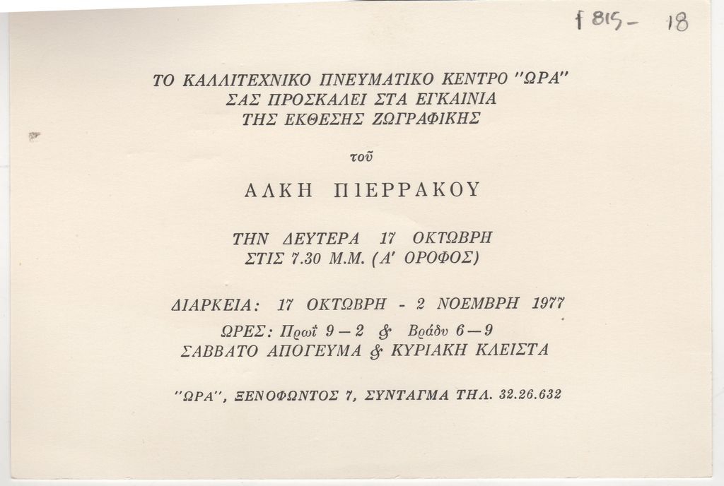 Πρόσκληση, χαρτόνι, 11×16 εκ., στα ελληνικά, εγκαινίων έκθεσης ζωγραφικής του Άλκη Πιερράκου.