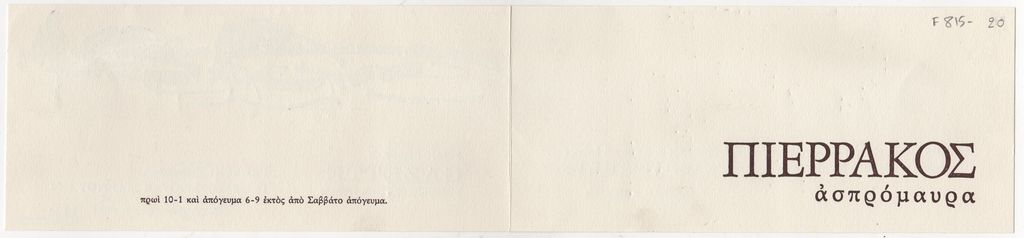 Πρόσκληση, χαρτόνι, 9×20 εκ., στα ελληνικά, εγκαινίων έκθεσης του Άλκη Πιερράκου.