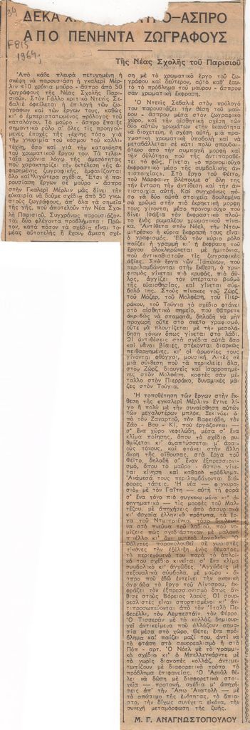 Απόκομμα, χαρτί ακανόνιστου μεγέθους, στα ελληνικά, δημοσίευσης κριτικής για την ομαδική έκθεση 50 καλλιτεχνών της Νέας Σχολής Παρισιού, στην γκαλερί Μέρλιν στην Αθήνα.