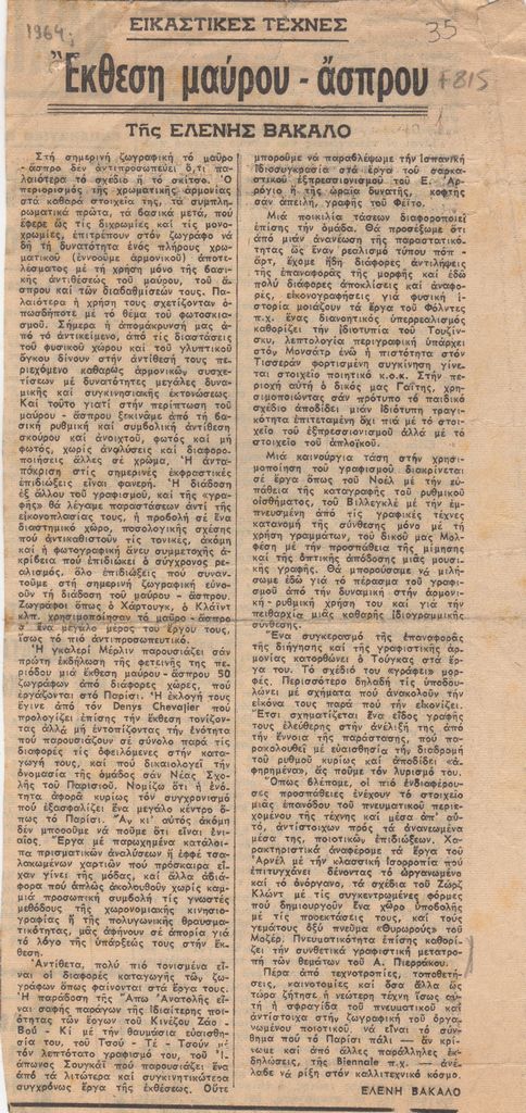 Απόκομμα, χαρτί, 23×11 εκ., στα ελληνικά, δημοσίευσης κριτικής ομαδικής έκθεσης 50 καλλιτεχνών της Νέας Σχολής Παρισιού, που εκθέτουν έργα τους στην γκαλερί Μέρλιν στην Αθήνα.