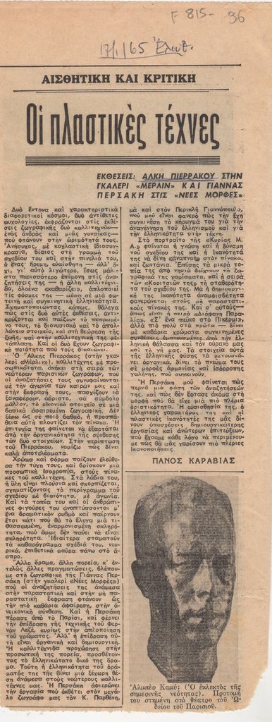 Απόκομμα, χαρτί, 28.5×11.5 εκ., στα ελληνικά, δημοσίευσης κριτικής έκθεσης του Άλκη Πιερράκου, η οποία διεξάγεται στην Γκαλερί Μέρλιν στην Αθήνα.