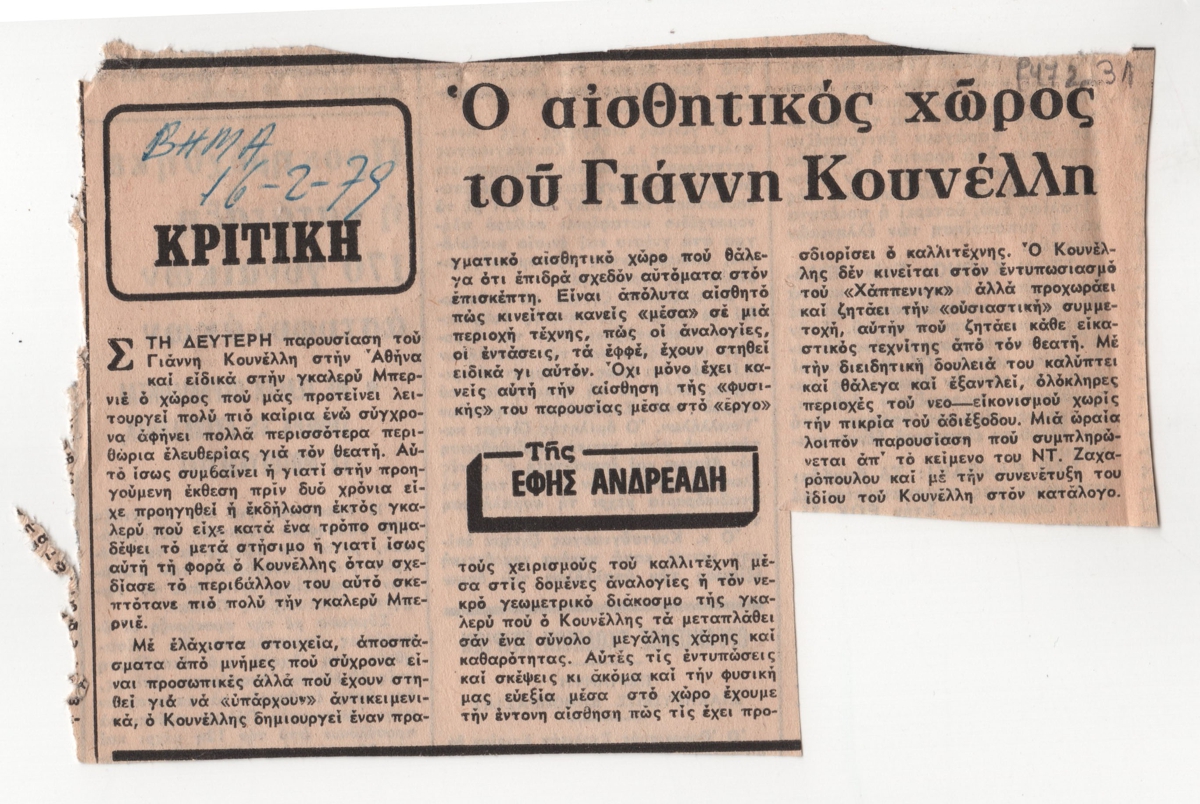 Απόκομμα, έντυπο, στα ελληνικά, σε χαρτί, 10,2×15,5 εκ., όπου δημοσιεύεται κριτική της Έφης Ανδρεάδης για την ατομική έκθεση του Γιάννη Κουνέλλη στην Αθήνα το 1979. Επάνω, επιγραφή με τα στοιχεία της δημοσίευσης.