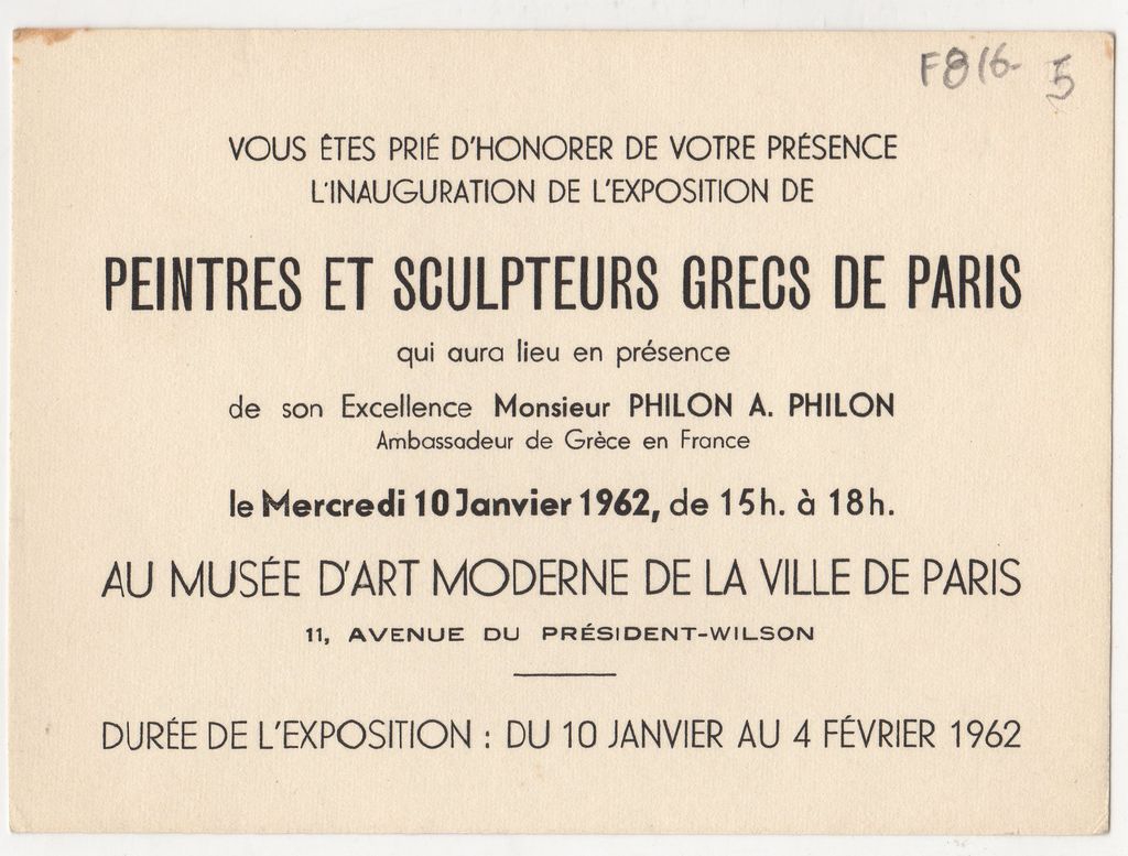 Πρόσκληση, χαρτόνι, 10×13,5 εκ., στα γαλλικά, εγκαινίων ομαδικής έκθεσης ζωγραφικής και γλυπτικής Ελλήνων καλλιτεχνών του Παρισιού, στο Μουσείο Μοντέρνας Τέχνης του Παρισιού.