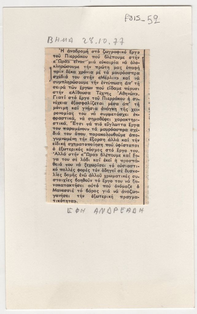 Απόκομμα, χαρτί, 16×10 εκ., στα ελληνικά, δημοσίευσης κριτικής έκθεσης του Άλκη Πιερράκου, η οποία διεξάγεται στο Καλλιτεχνικό Πνευματικό Κέντρο Ώρα στην Αθήνα.