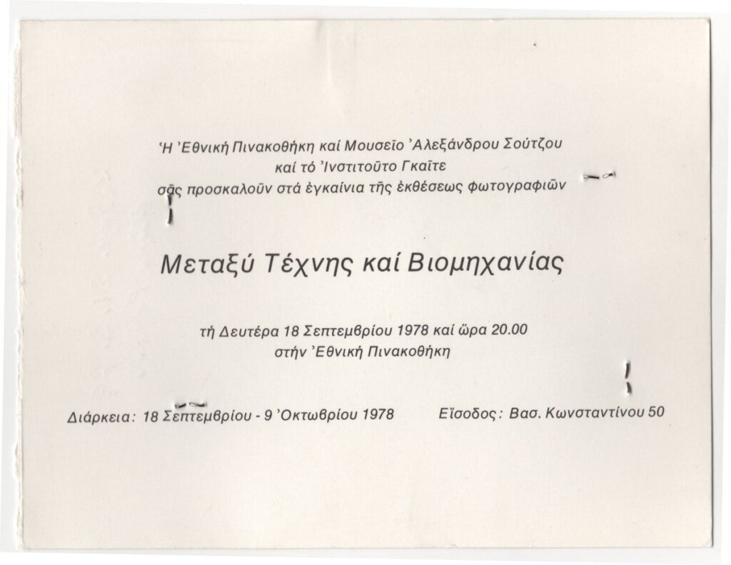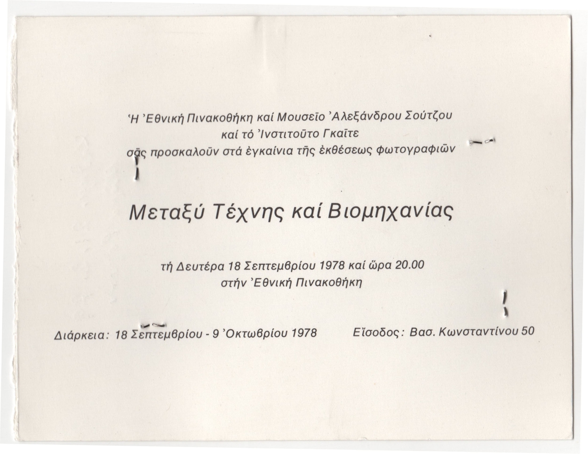 Απόκομμα εντύπου έκθεσης, στα ελληνικά, μονόφυλλο, χαρτόνι, 11,5×15,0 εκ. Πρόσκληση εγκαινίων της ομαδικής έκθεσης φωτογραφιών με τίτλο “Μεταξύ Τέχνης και Βιομηχανίας” που διοργανώθηκε στην Εθνική Πινακοθήκη στην Αθήνα το 1978.
