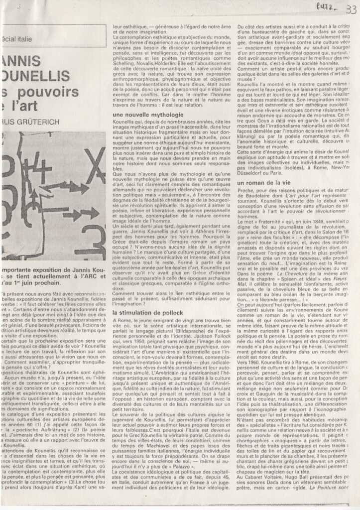 Φωτοαντίγραφο αποκόμματος εντύπου, στα γαλλικά, χαρτί, 2 φφ, 29,8×21,2 εκ. Άρθρο του Marlis Grüterich για τον εικαστικό Γιάννη Κουνέλλη με αφορμή την έκθεσή του στο Παρίσι το 1980. Εικονογραφείται με αναπαραγωγές έργων.