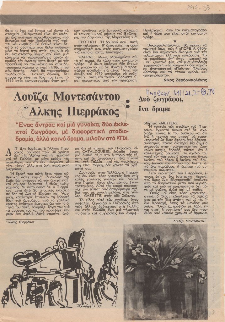 Απόκομμα, χαρτί διπλής όψης, 29,5×21 εκ., στα ελληνικά, δημοσίευσης άρθρου για τους Λουΐζα Μοντεσάντου και Άλκη Πιερράκο, με αφορμή εκθέσεις των καλλιτεχνών στο βιβλιοπωλείο Gazette και γκαλερί Κρεωνίδης αντίστοιχα. Δίνονται αποσπάσματα συνέντευξής τους.