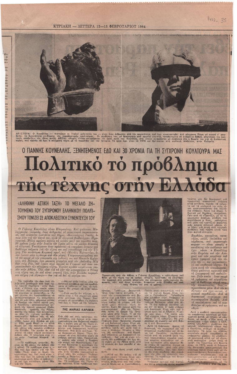 Απόκομμα, έντυπο, στα ελληνικά, χαρτί, 2 φφ., 43,0×25,0 και 12,0×10,7 εκ. Συνέντευξη του εικαστικού Γιάννη Κουνέλλη στη Μαρία Καραβία. Αναφέρεται επικείμενη έκθεση του καλλιτέχνη στη Γερμανία. Εικονογραφείται με αναπαραγωγή φωτογραφίας και έργων του καλλιτέχνη. Στο δεύτερο απόκομμα επιγραφή με τα στοιχεία δημοσίευσης. Στην πίσω όψη αποσπάσματα άρθρων από την πολιτική επικαιρότητα