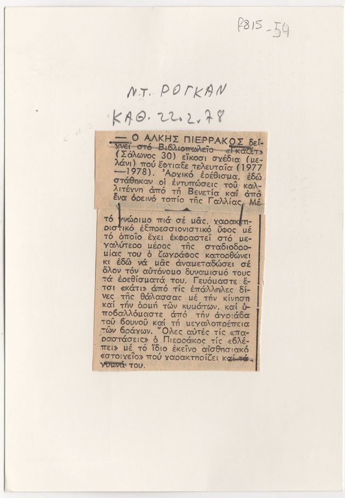 Απόκομμα, χαρτί, 2 φφ συρραμμένα σε έντυπο, 15×10,5 εκ., στα ελληνικά, δημοσίευσης κριτικής έκθεσης του Άλκη Πιερράκου, η οποία διεξάγεται στο βιβλιοπωλείο Gazette στην Αθήνα.