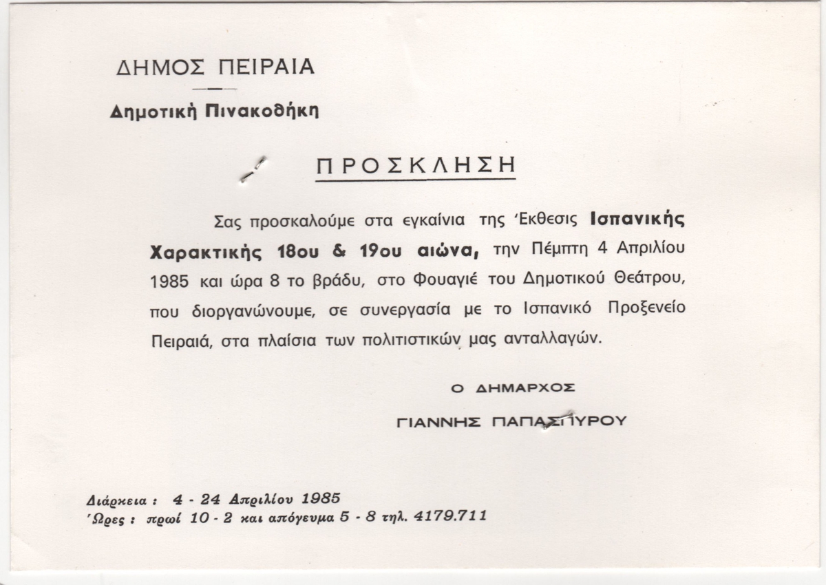 Έντυπο έκθεσης, στα ελληνικά, μονόφυλλο, χαρτόνι, 11,5×16,4 εκ. Πρόσκληση εγκαινίων της ομαδικής έκθεσης με τίτλο “Ισπανική Χαρακτική 18ου & 19ου αιώνα”, που διοργανώθηκε από τον Δήμο Πειραιά σε συνεργασία με το Ισπανικό Προξενείο Πειραιά το 1985.