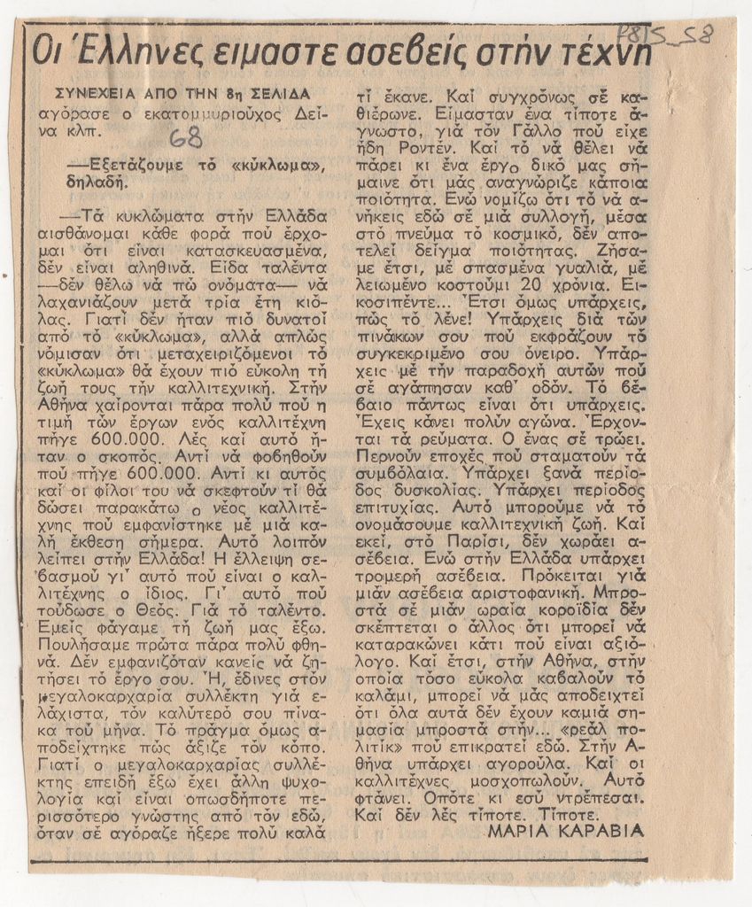 Απόκομμα, χαρτί, 2 φφ, 43×31 και 13,5×11,5 εκ., στα ελληνικά, δημοσίευσης συνέντευξης του Άλκη Πιερρράκου. Ο καλλιτέχνης μιλά για την γαλλική και ελληνική ζωγραφική και για τη σχέση τέχνης κοινωνίας και πολιτικής.