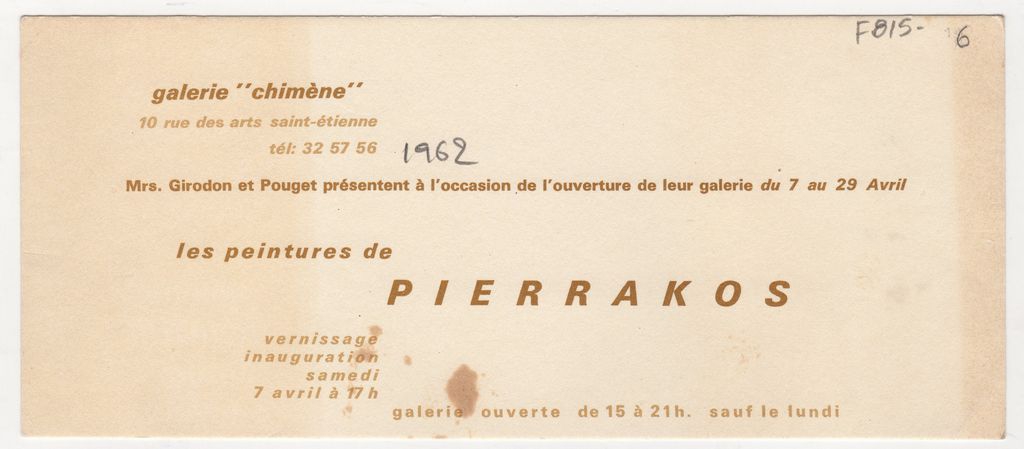 Πρόσκληση, χαρτόνι, 9×21 εκ., στα γαλλικά, εγκαινίων ατομικής έκθεσης ζωγραφικής του Άλκη Πιερράκου, στο Παρίσι.