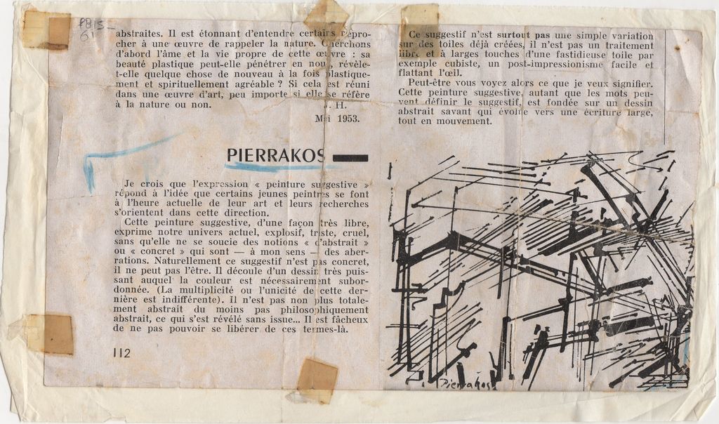 Απόκομμα, χαρτί κολλημένο σε κόλλα, 13.5×22.5 εκ., στα γαλλικά, δημοσίευσης άρθρου αναφερόμενου στο εικαστικό έργο του Άλκη Πιερράκου.
