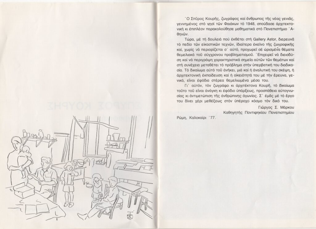 Έντυπο, χαρτί ιλλουστρασιόν, 8 φφ, 24,5×17,5 εκ., στα ελληνικά, ατομικής έκθεσης ζωγραφικής του Σπύρου Κουρή. Περιέχει κείμενα των Γ. Μάρκου, Δ. Μπαϊρακτάρη με τίτλο “Ο μύθος και η πραγματικότητα της εικόνας”, Στ. Λυδάκη, Cl. Schwarzenberg και του καλλιτέχνη, αναφερόμενα στο έργο του.