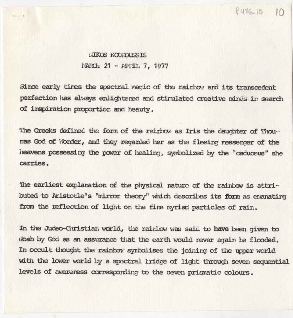 Φωτοαντίγραφο, χαρτί, 2 φφ, 18×17 εκ., στα αγγλικά, δημοσίευσης κειμένου για τον Νίκο Κουρούση και το έργο του. Περιέχει αποσπάσματα κριτικών.
