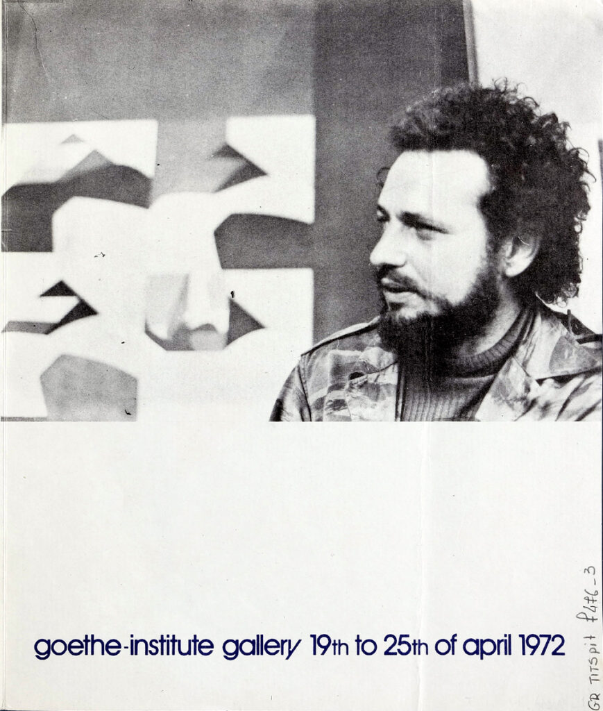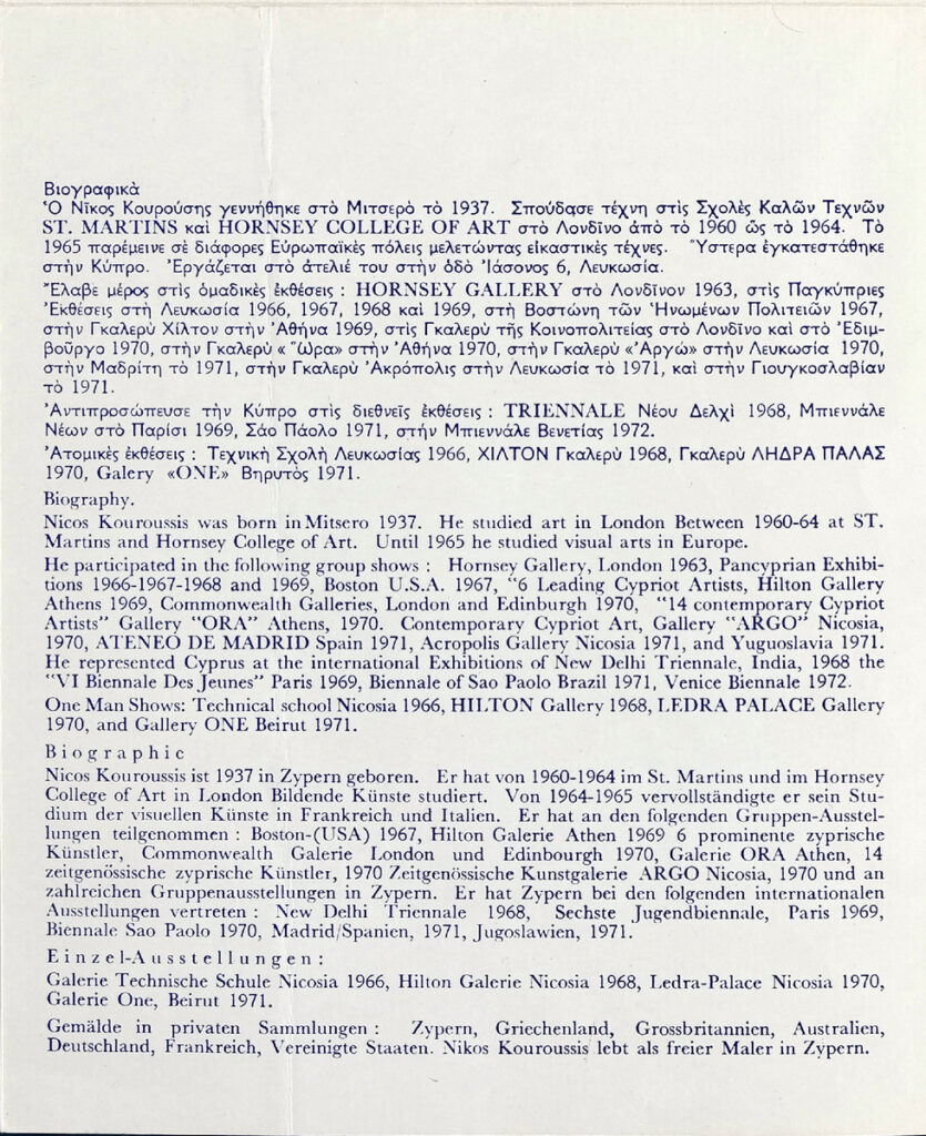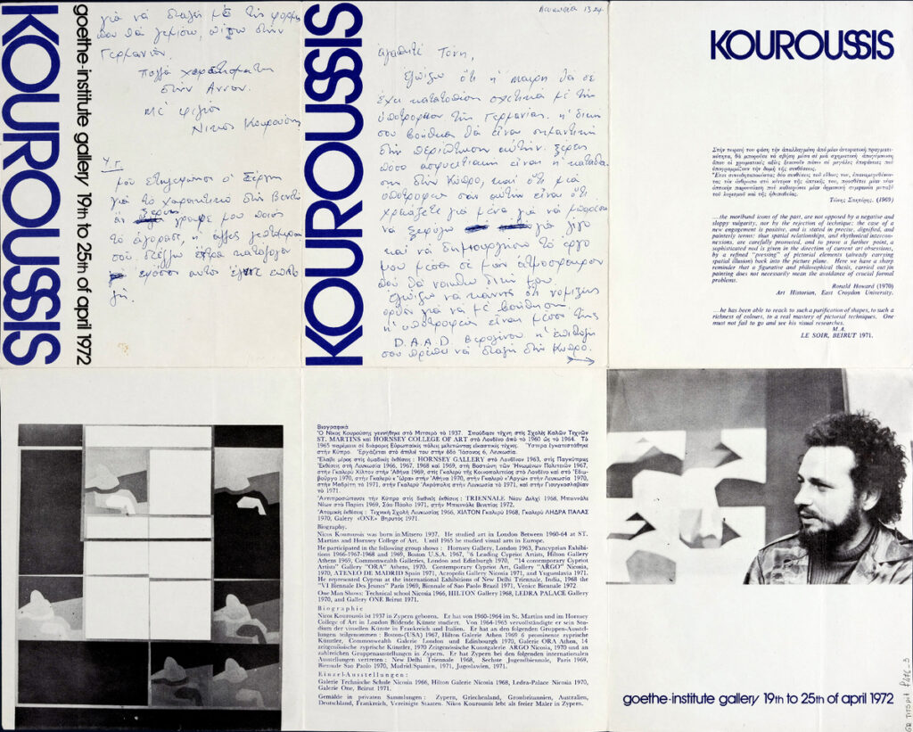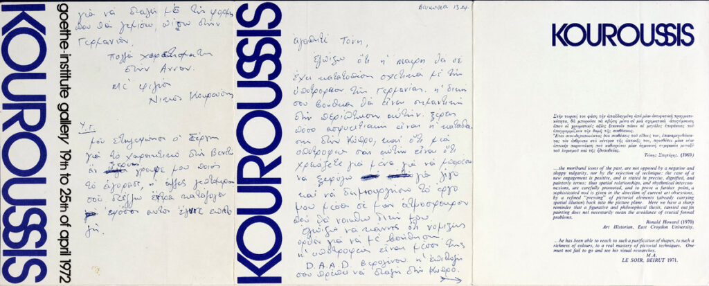 Έντυπο της ατομικής έκθεσης ζωγραφικής του Νίκου Κουρούση στο Ινστιτούτο Goethe Αθηνών. Περιέχει χειρόγραφη επιστολή του καλλιτέχνη προς τον Τώνη Σπητέρη.