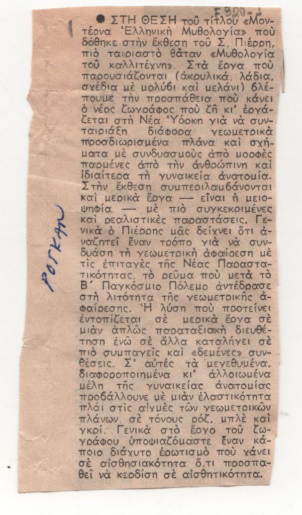 Απόκομμα, έντυπο, χαρτί, 11,5×6,0 εκ., όπου δημοσιεύεται, στα ελληνικά, κριτική της Ντόρας Ηλιοπούλου-Ρογκάν για την ατομική έκθεση του Σ. Πιέρρη με τίτλο “Μοντέρνα Ελληνική Μυθολογία [στην Ελληνοαμερικανική Ένωση, 1977]. Αριστερά, επιγραφή.