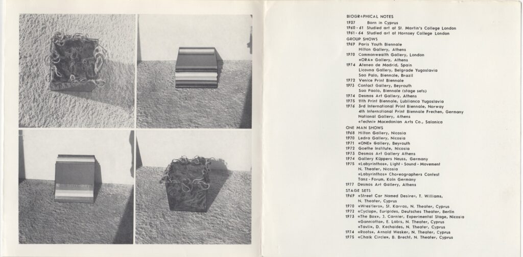 Έντυπο, χαρτί ιλλουστρασιόν δίπτυχο, 19×18 εκ., στα ελληνικά και αγγλικά, του Νίκου Κουρούση. Περιέχει βιογραφικό του καλλιτέχνη και εικονογράφηση.