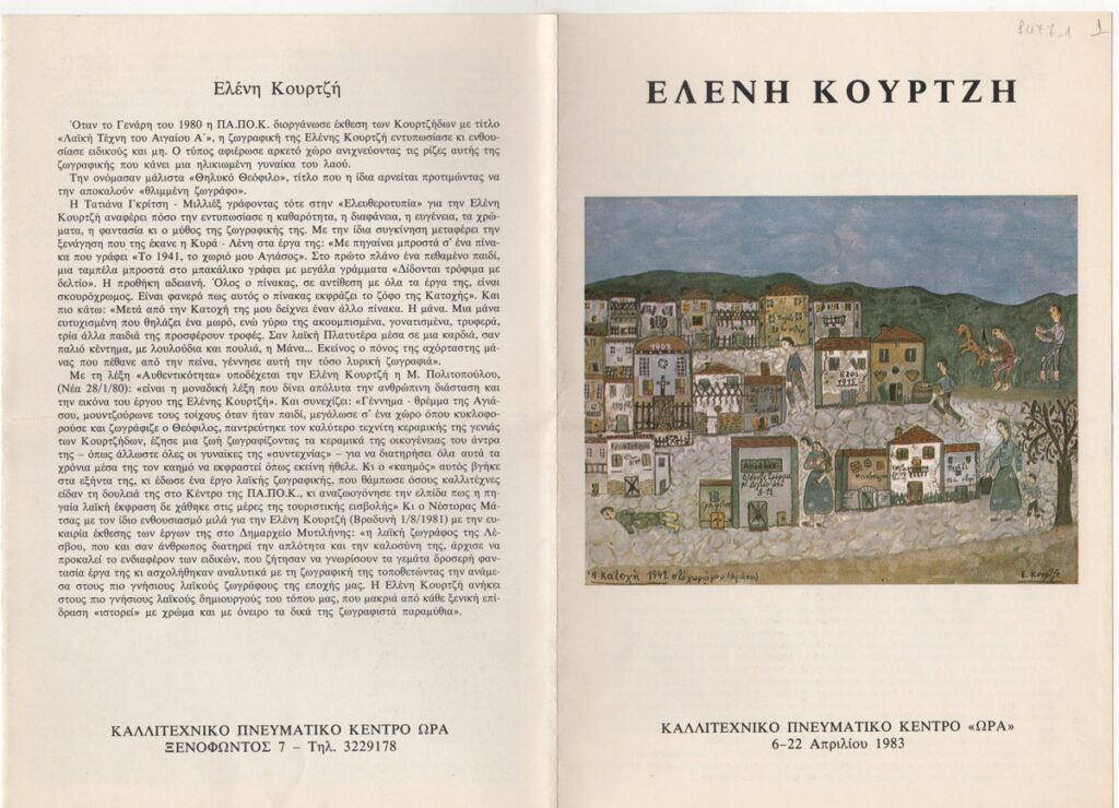 Έντυπο, χαρτί ιλλουστρασιόν δίπτυχο, 24,5×17 εκ., στα ελληνικά, ατομικής έκθεσης ζωγραφικής της Ελένης Κουρτζή. Περιέχει κείμενο και βιογραφικό της καλλιτέχνιδας.