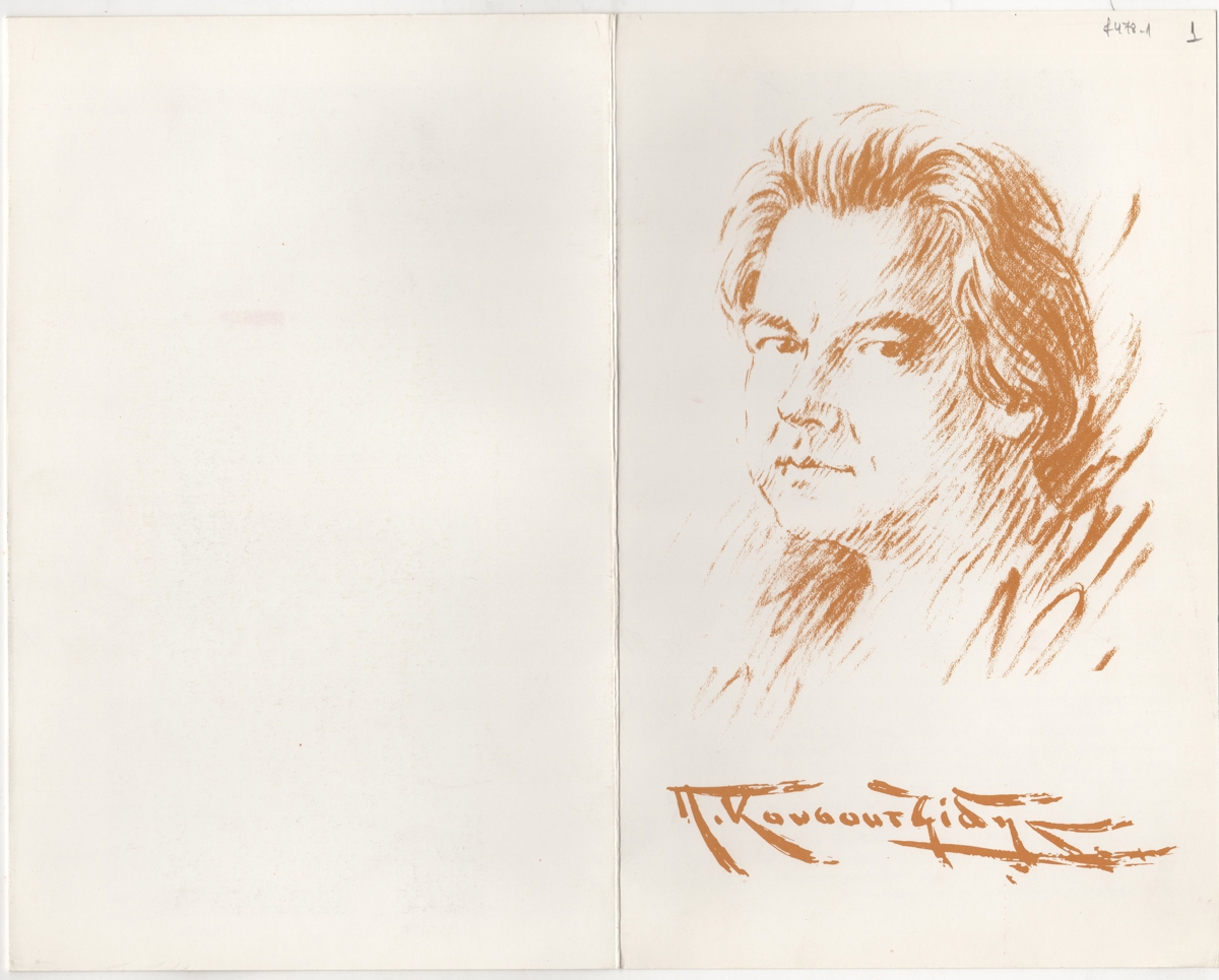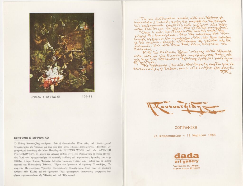 Έντυπο, χαρτόνι δίπτυχο, 25×16 εκ., στα ελληνικά, ατομικής έκθεσης του Πάνου Κουσουτζίδη. Περιέχει βιογραφικό του καλλιτέχνη και εικονογράφηση.