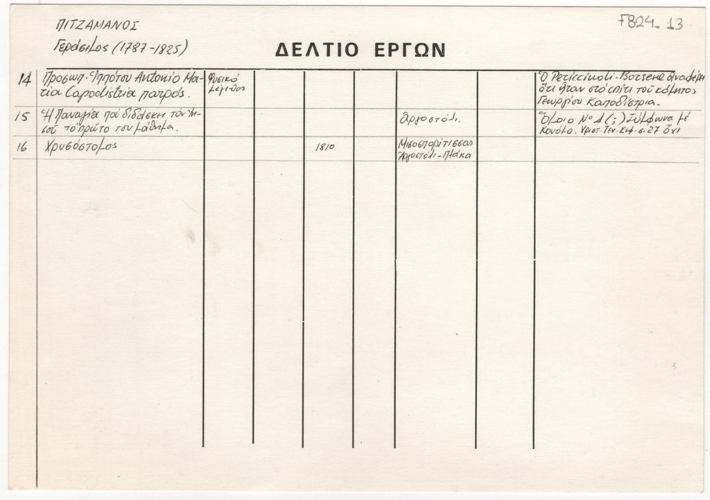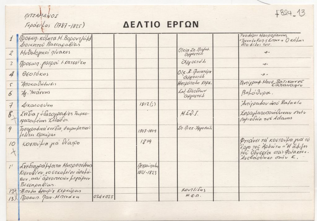 Κείμενο, χειρόγραφο, με μαύρο μελάνι, στα ελληνικά, σε καρτέλα, έντυπη, χαρτόνι, 14,0×20,0 εκ., κείμενο στις δύο όψεις. Δελτίο έργων του Γεράσιμου Πιτσαμάνου.