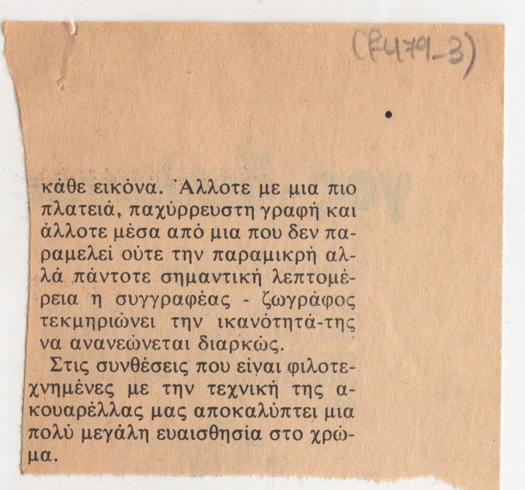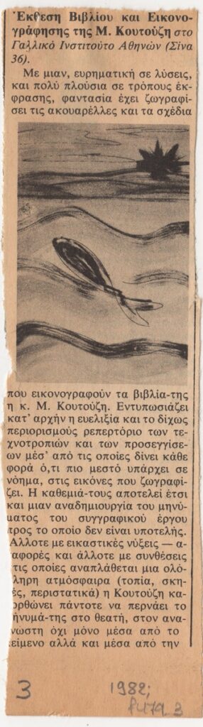 Αποκόμματα, χαρτί, 2 φφ, 17,5×5 και 6×5 εκ., στα ελληνικά, δημοσίευσης κριτικής έκθεσης της Μαριάννας Κουτούζη, η οποία διεξάγεται στο Γαλλικό Ινστιτούτο Αθηνών.