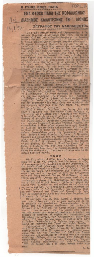 Απόκομμα, έντυπο, χαρτί, 25,8×8,7 εκ., όπου δημοσιεύεται, στα ελληνικά, άρθρο του Κ. Κ. για τον Γεράσιμο Πιτσαμάνο. Αριστερά, επιγραφή με τα στοιχεία της δημοσίευσης.